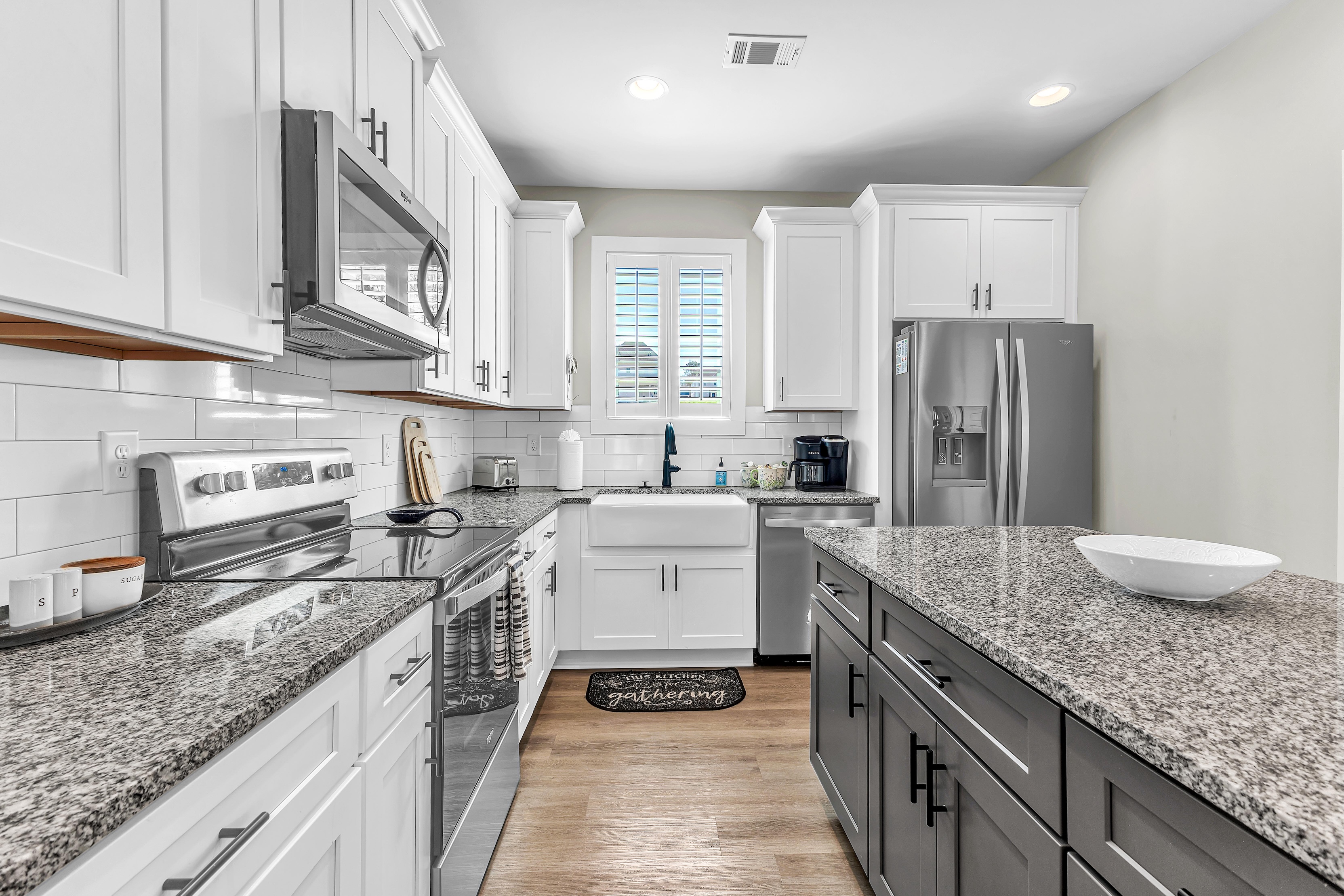 The fully equipped kitchen includes stainless steel appliances, granite countertops, and a large island—perfect for cooking meals or gathering with friends and family. The open living and dining areas provide plenty of room to unwind, watch TV, or enjoy a meal together.