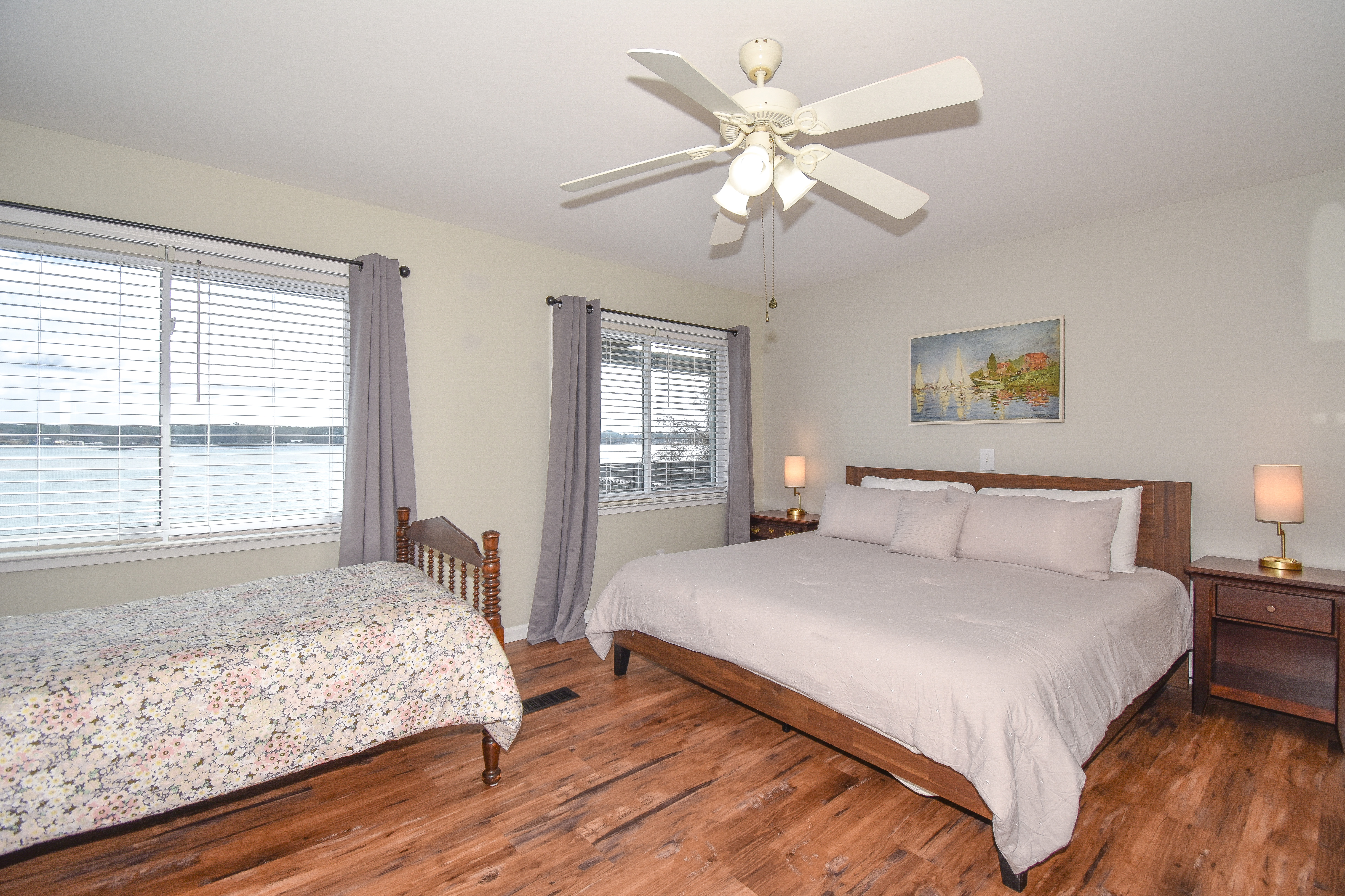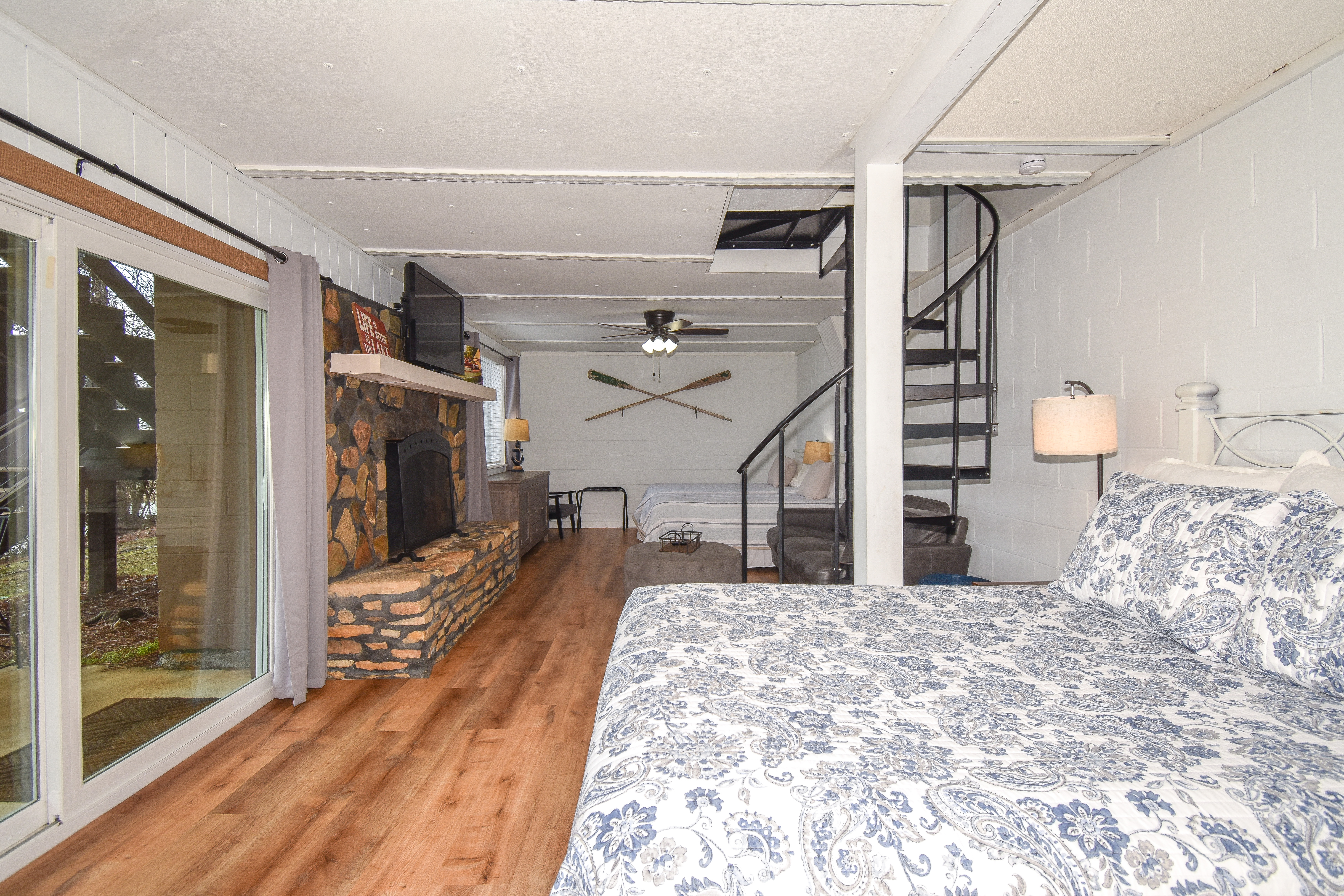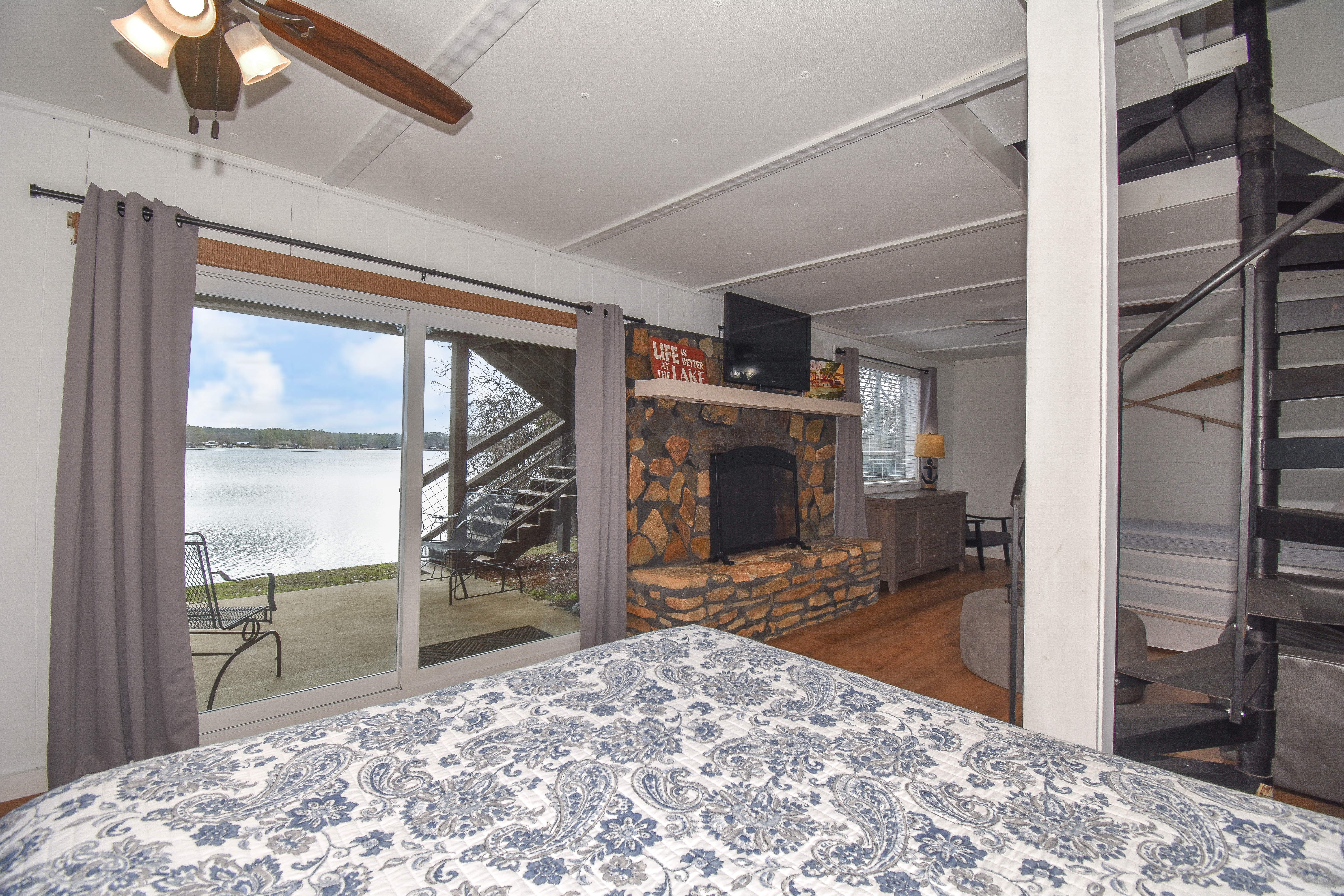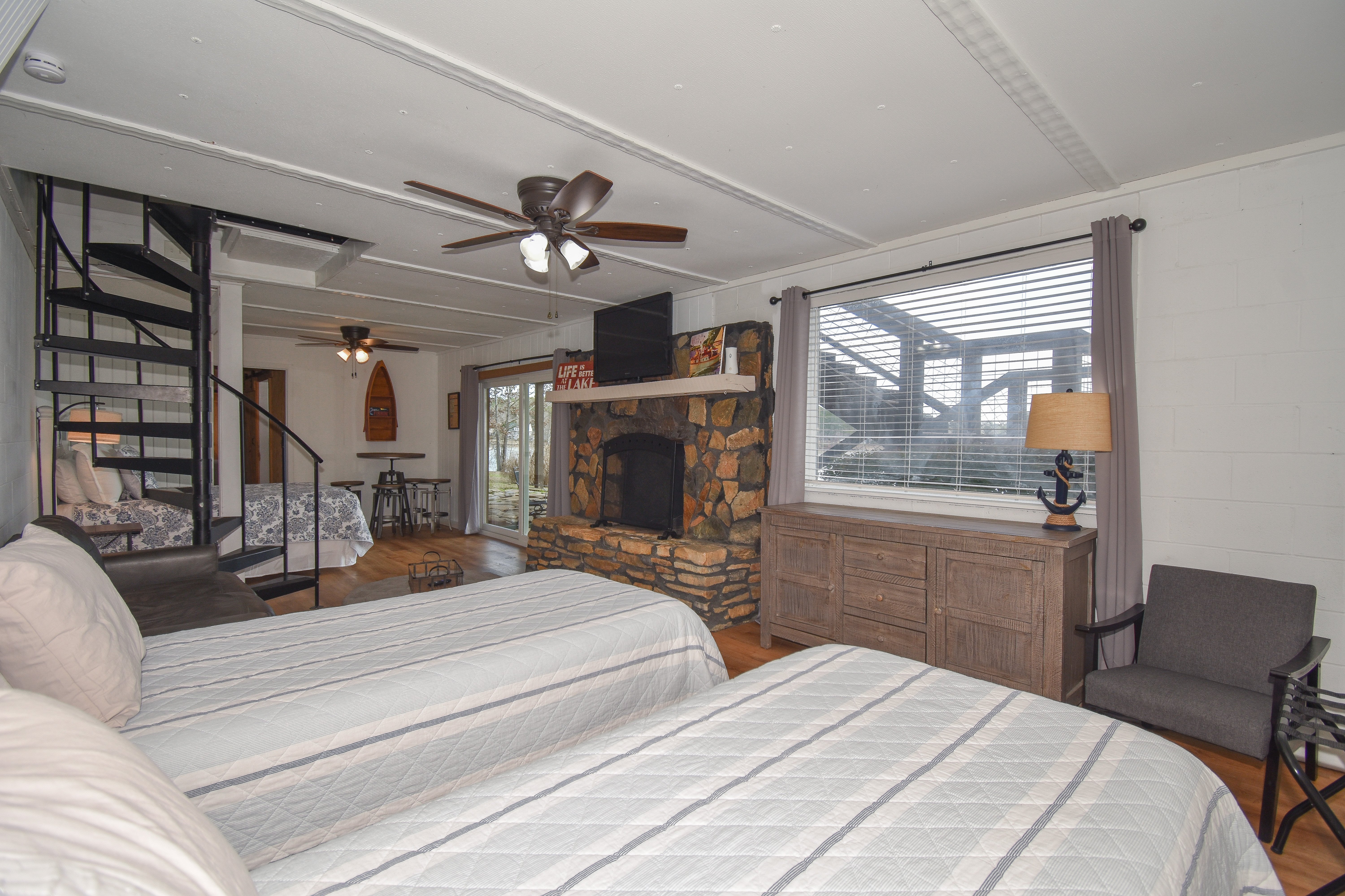 Heading down the spiral staircase to the basement, you will find a queen bedroom with an ensuite shower bathroom, and an extra queen bed with two twins in the living space. From this level, you can walk out to the patio that is ground level to the pier and dock area. If you have someone in your party that is not able to access the spiral staircase, they can access the bottom level from this patio.
