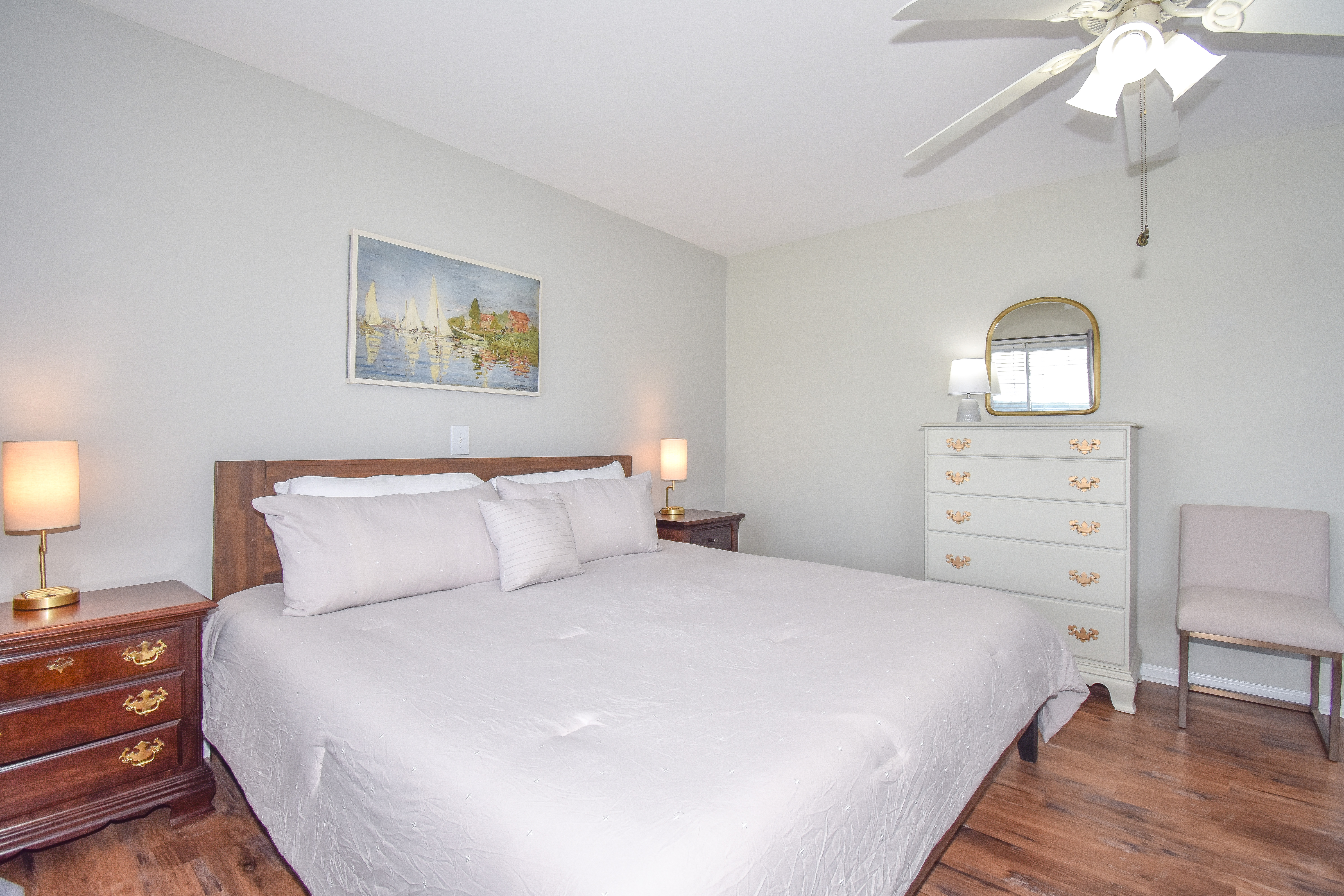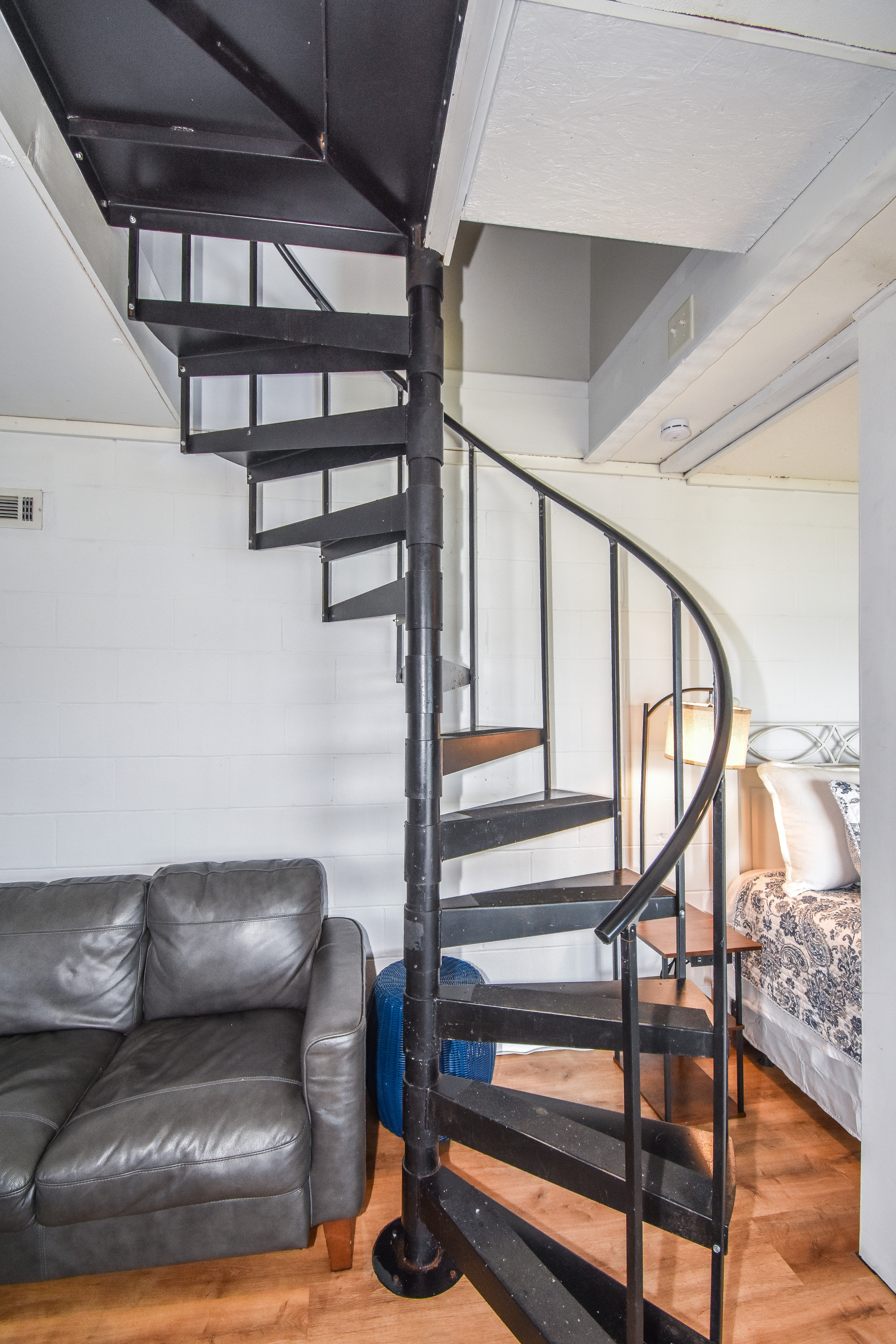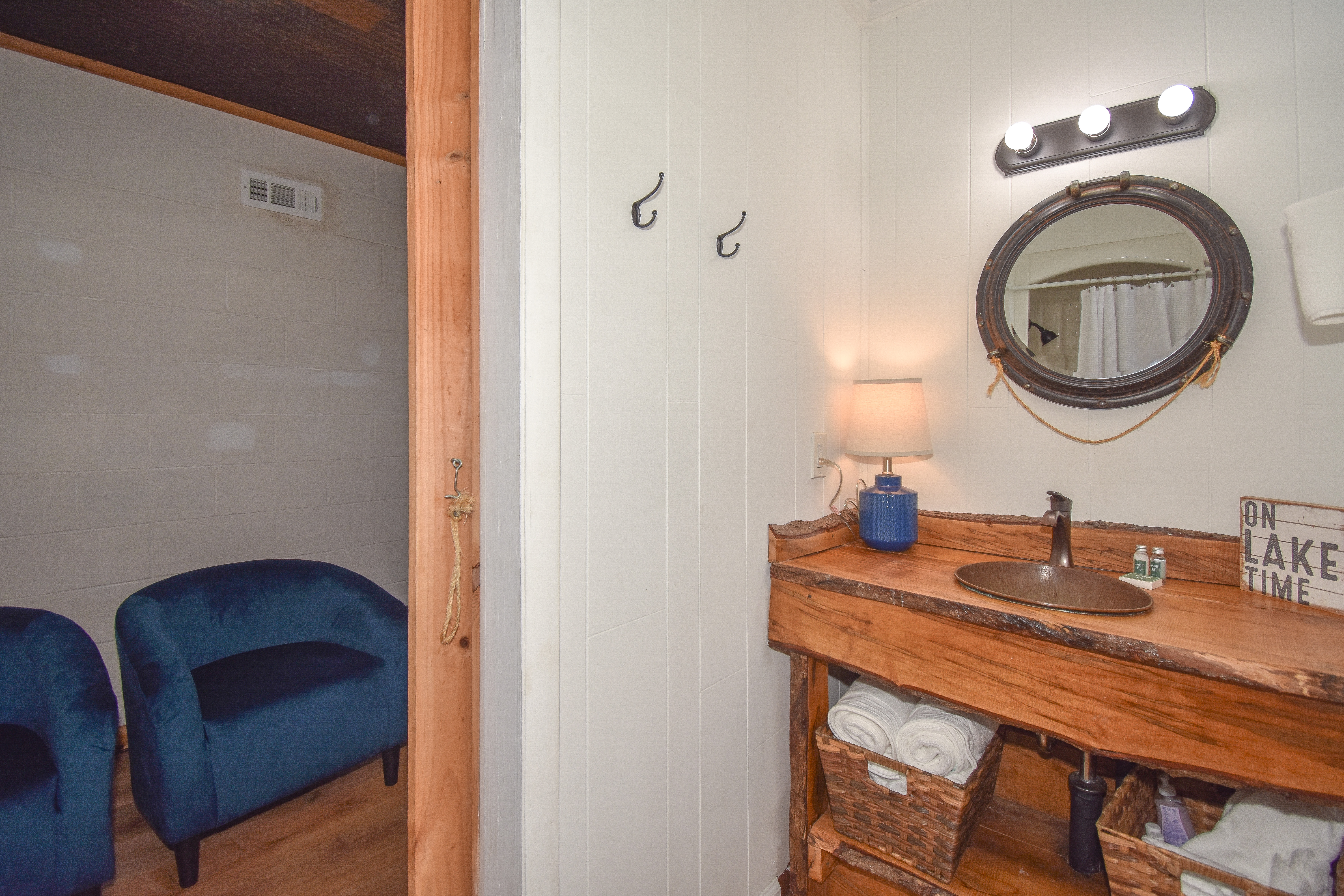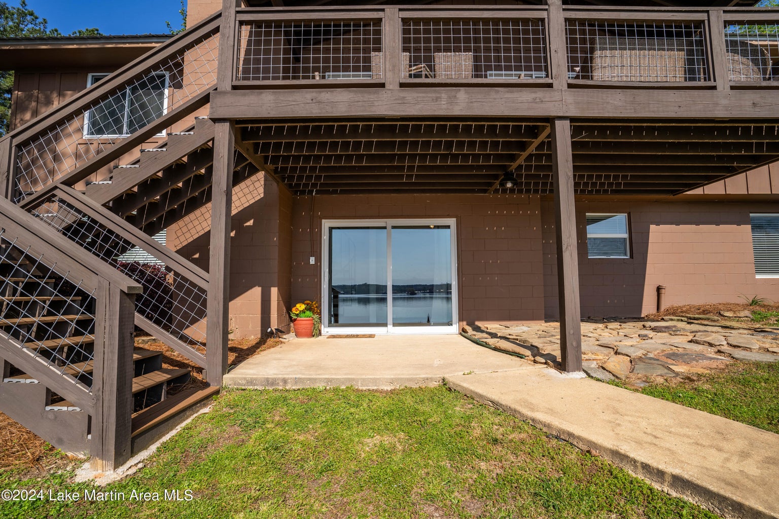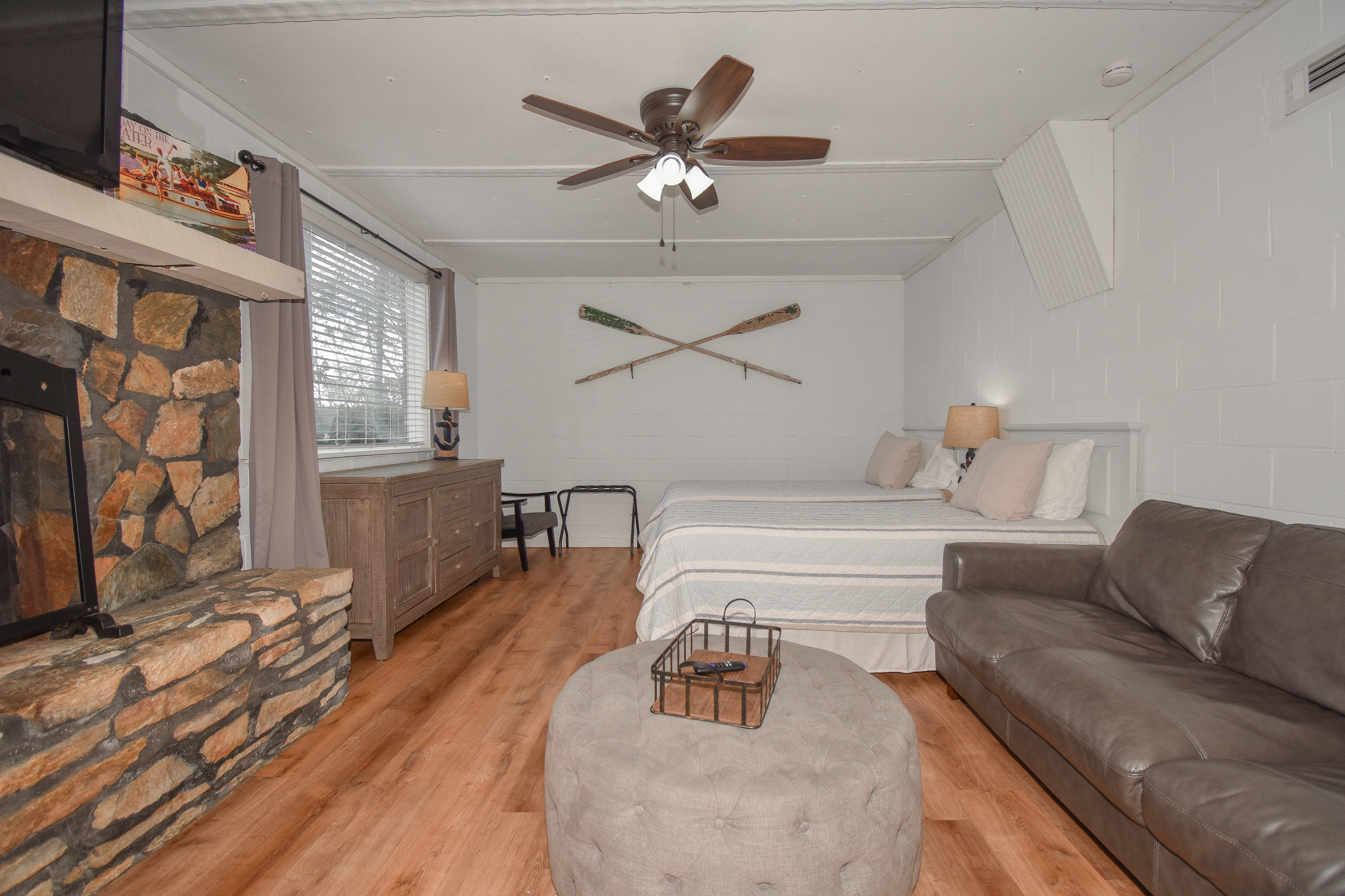 Heading down the spiral staircase to the basement, you will find a queen bedroom with an ensuite shower bathroom, and an extra queen bed with two twins in the living space. From this level, you can walk out to the patio that is ground level to the pier and dock area. If you have someone in your party that is not able to access the spiral staircase, they can access the bottom level from this patio.