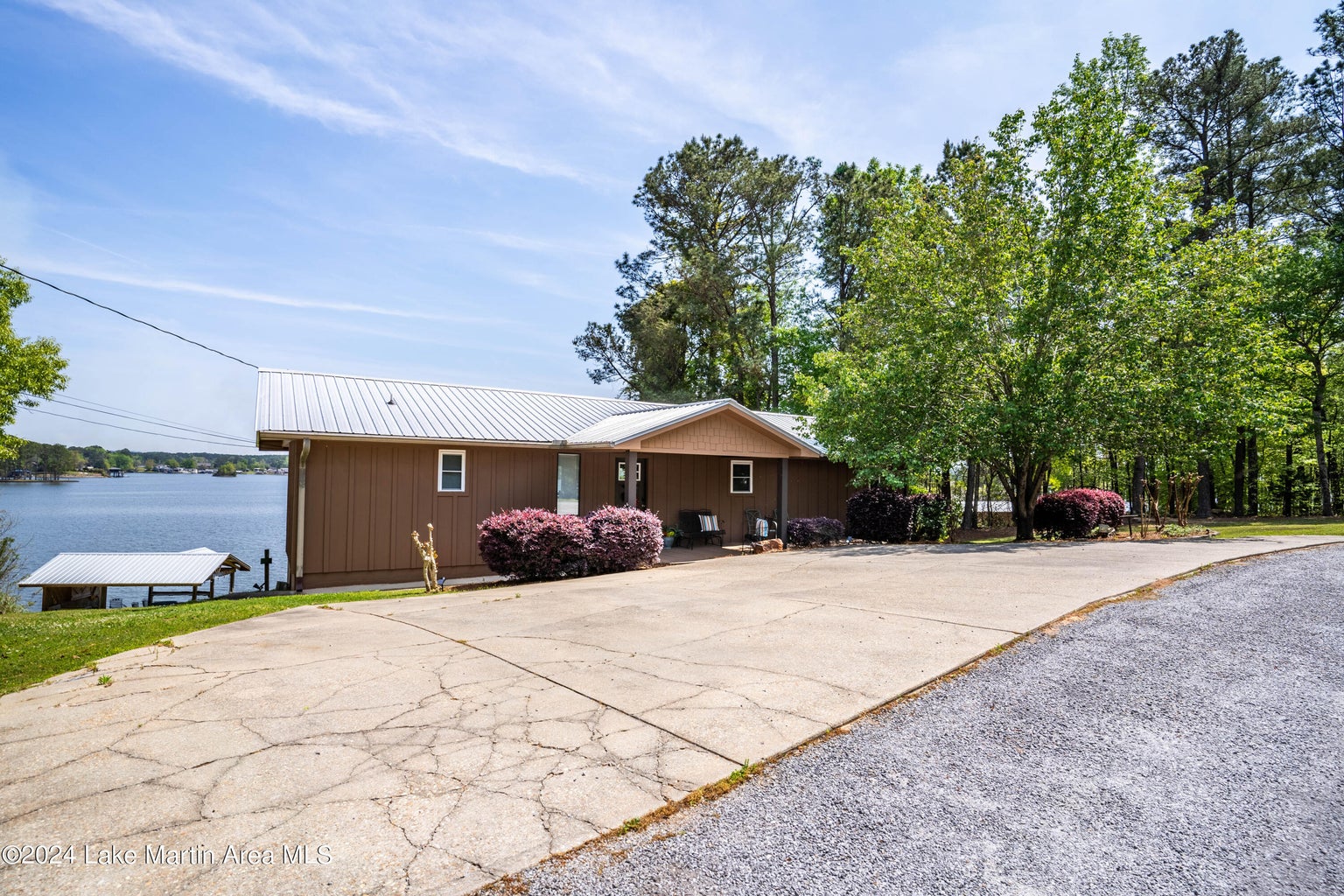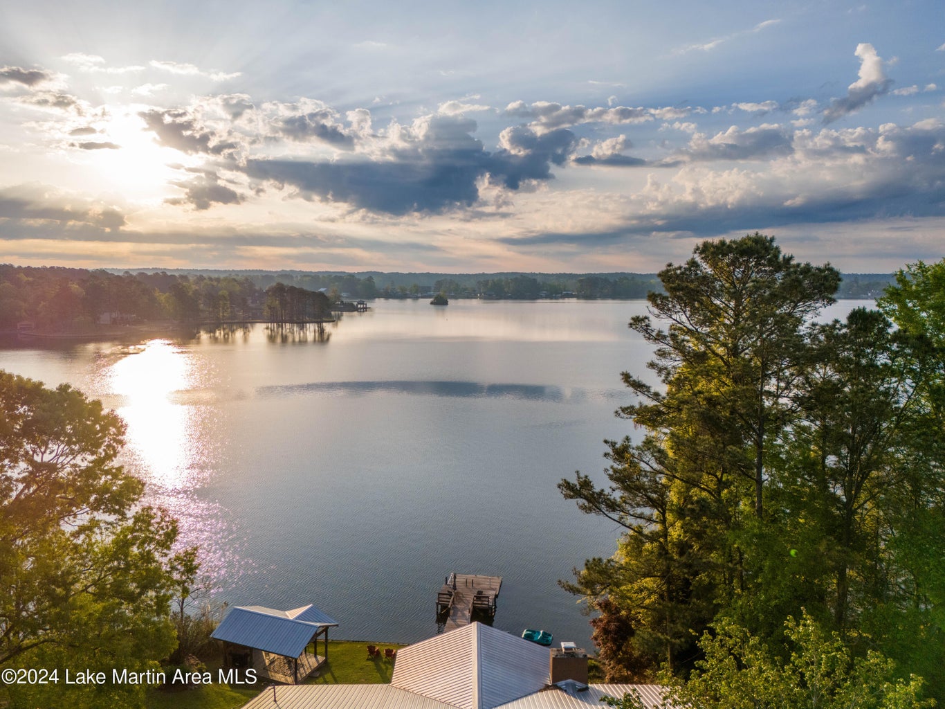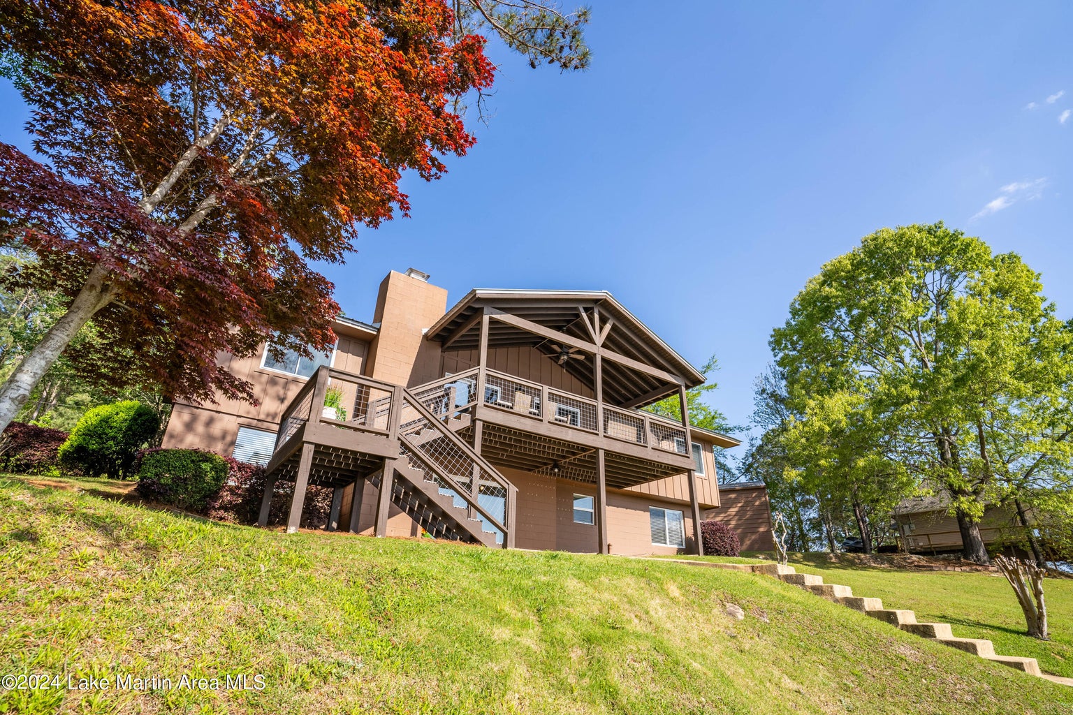 You will enter into the main level of the home where you will find a breakfast nook and a well equipped kitchen complete with a small fridge for beverage storage. You can't miss the beautiful view of the lake from the open concept living room area with a large screen TV. The beautiful back deck is located just off the living space where you will find a spot to dine and relax as you take in those awesome Lake Martin sunsets! Also on the main level is the primary bedroom with an ensuite bathroom that has an amazing soaking tub and a standing shower and another king w/twin bedroom, both with stunning lake views! The hallway bathroom is located off of the living area that has a tub and shower combo.