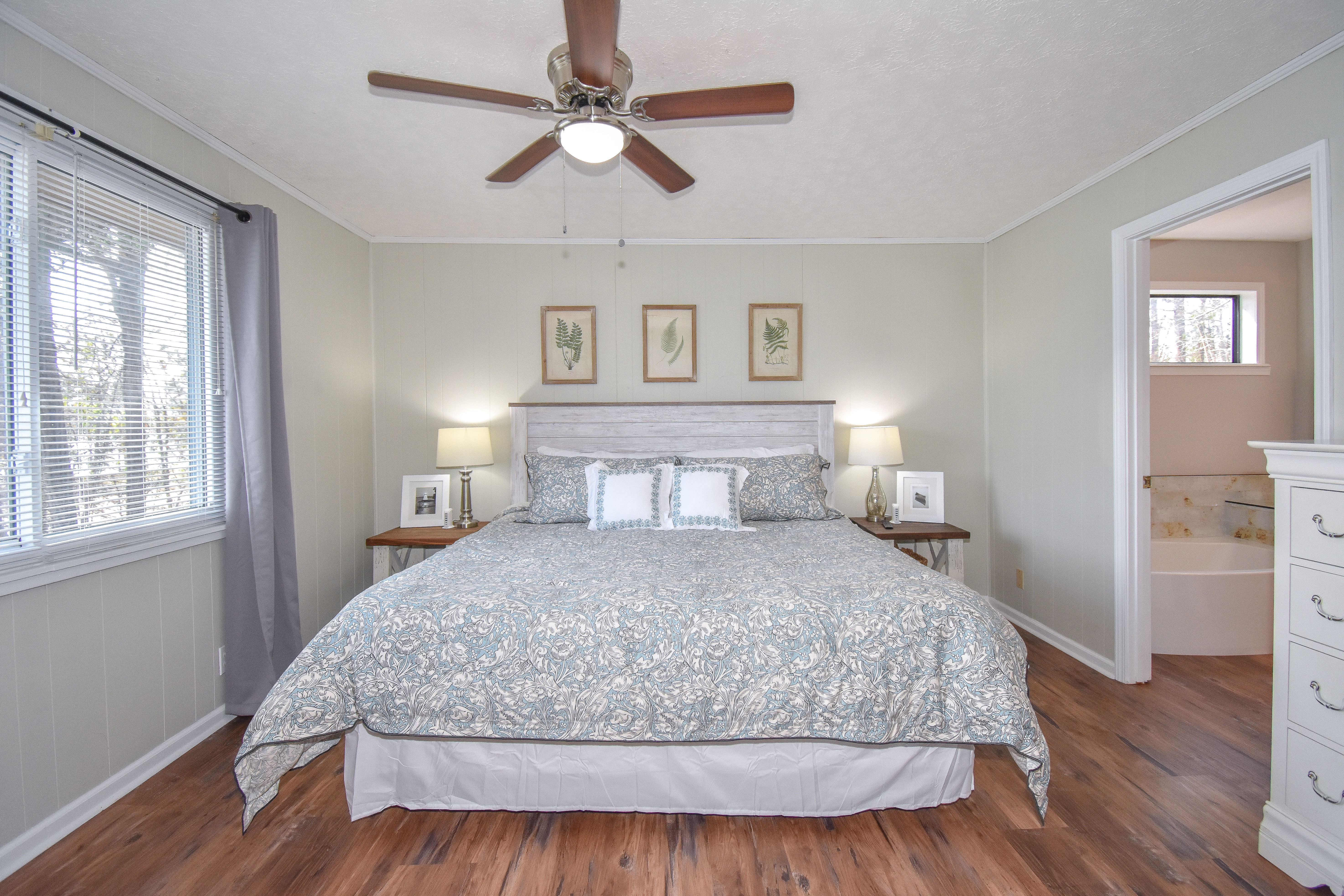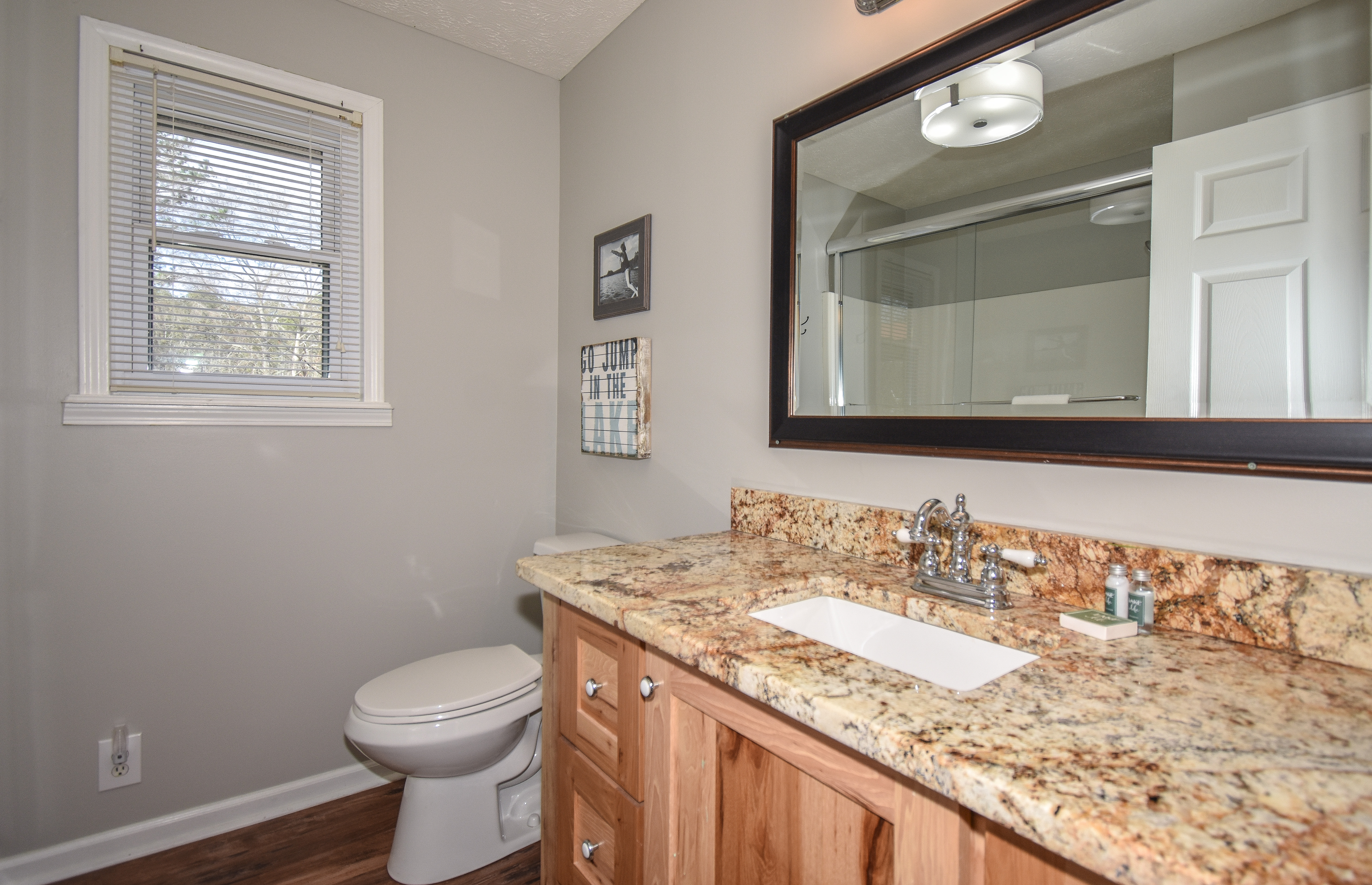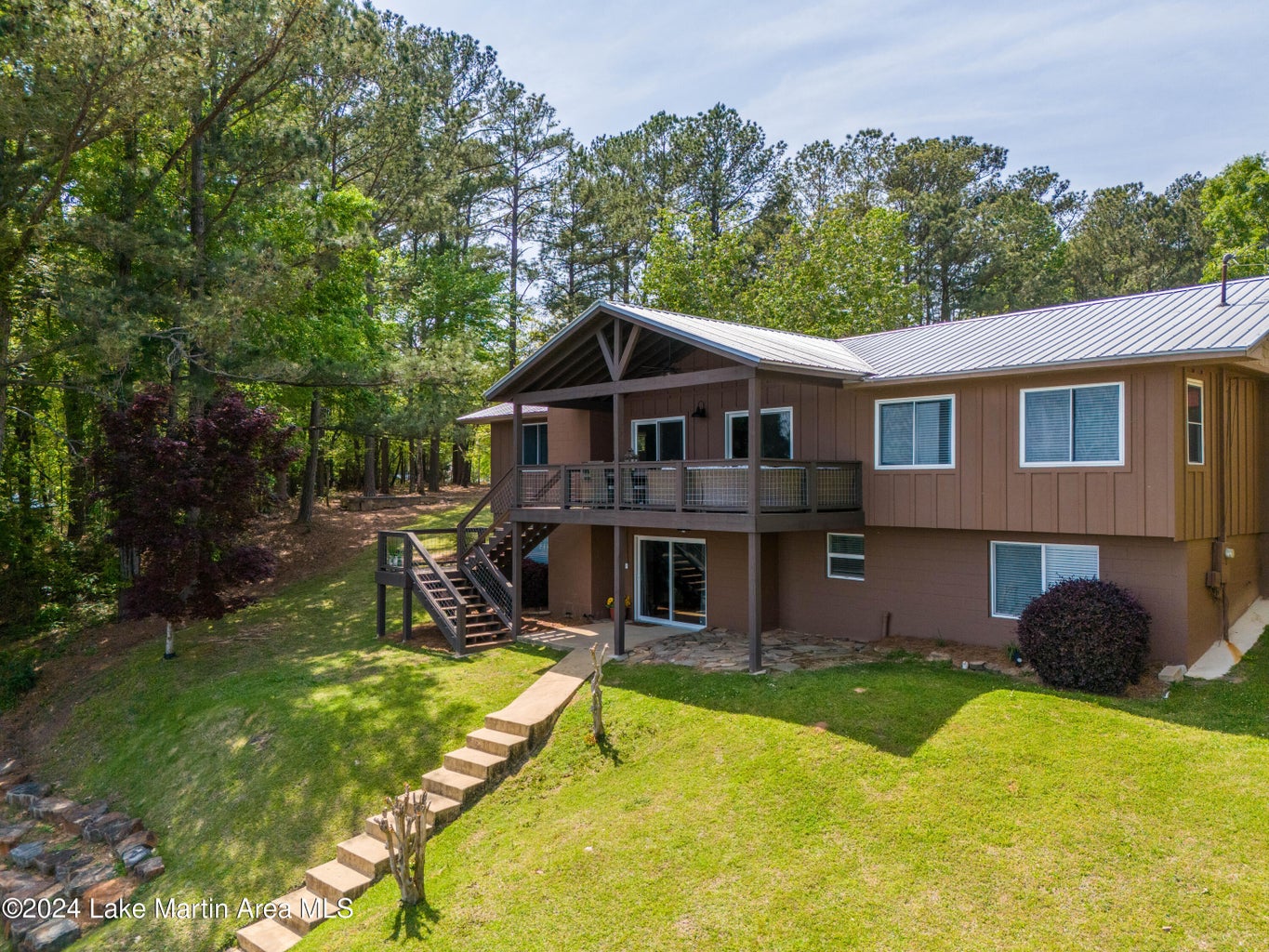 You will enter into the main level of the home where you will find a breakfast nook and a well equipped kitchen complete with a small fridge for beverage storage. You can't miss the beautiful view of the lake from the open concept living room area with a large screen TV. The beautiful back deck is located just off the living space where you will find a spot to dine and relax as you take in those awesome Lake Martin sunsets! Also on the main level is the primary bedroom with an ensuite bathroom that has an amazing soaking tub and a standing shower and another king w/twin bedroom, both with stunning lake views! The hallway bathroom is located off of the living area that has a tub and shower combo.